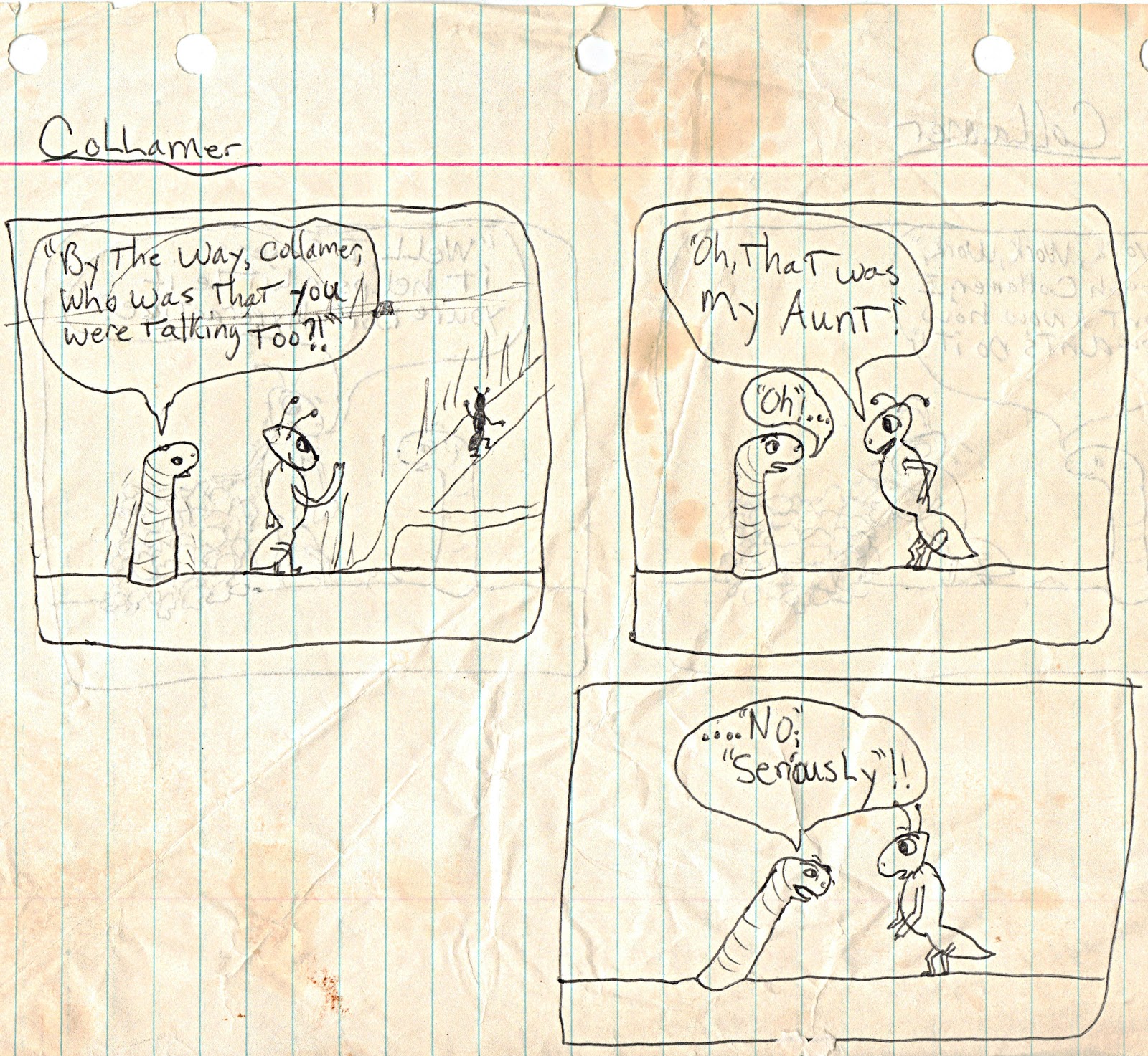 Ants were my favorite bugs. I guess because they were always doing something, and usually in one spot, like at their anthill. These next three comic strips represent my attempt to spinoff Gralen and Jeddy into another comic strip about an ant named Collamer.